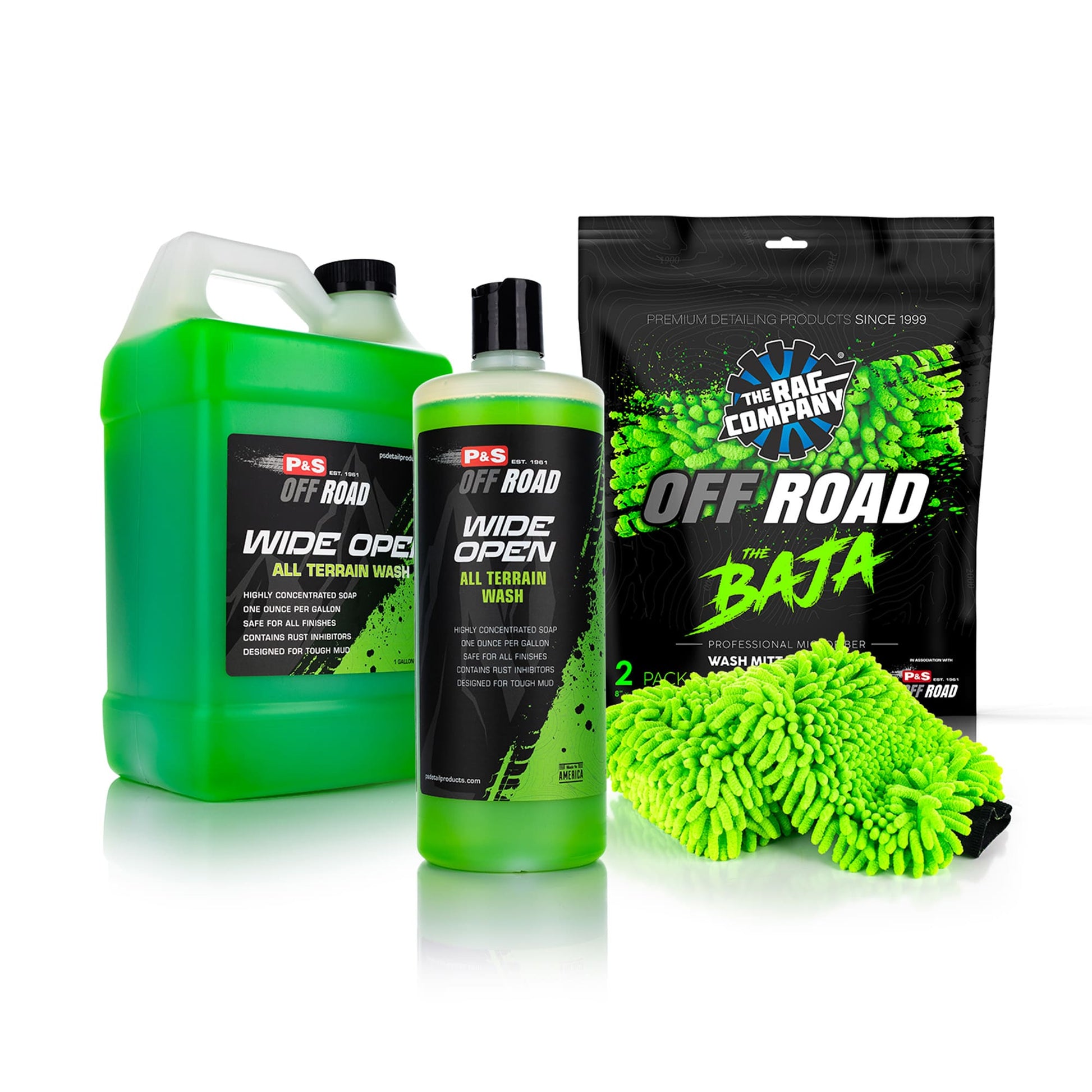 At the heart of the bundle is P&S Wide Open All Terrain Wash, a high-foaming, high-lubricity formula built to break down heavy soil and environmental buildup without harming sensitive surfaces. It delivers a safe, effective clean on paint, wraps, plastics, metal, rubber, and coated components—perfect for vehicles that endure rugged terrain.